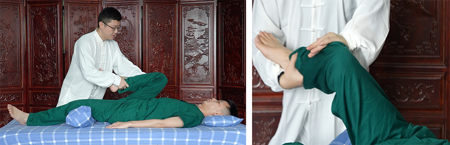 该法是拿揉点按+牵拉旋转等复合手法。患者仰卧,术者先拿揉下肢肌肉,点按环跳、阳陵泉等穴位,再由助手固定骨盆,术者托住患侧小腿及膝部,实施屈髋旋转及适度牵拉,重复5-10次。要求术者手法轻柔、动作缓慢、力度均匀,与患者呼吸协调,术前评估髋关节活动度,避免过度牵拉。能松解髋部软组织,改善关节活动范围。常用于髋关节功能障碍、髋部软组织病变。