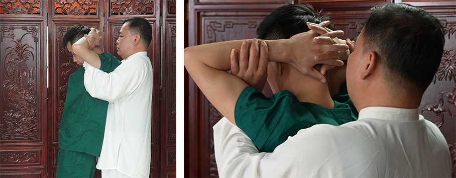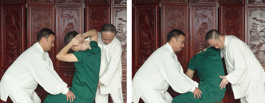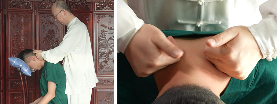 该法是推法、点法、按法的复合手法。患者取骑坐位,术者站于其后,双手交叉置于颈部,以拇指罗纹面自风池穴沿夹脊穴及膀胱经向下分推,至大椎穴汇合,再向肩井穴点按;重复2-3次,力度由轻渐重,保持均匀、柔和、深透。要求动作协调,注重沉肩旋腕,避免僵硬。能松解颈部软组织粘连,改善局部血供,为颈椎整复奠定基础。常用于各型颈椎病。