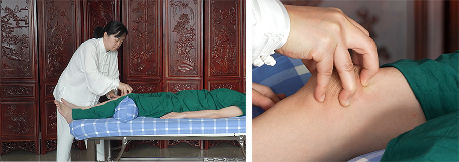 该法是“揉、提、拿”的复合手法。患者仰卧,术者取弓步站立,先以拿揉法松解下肢肌群,再以五指抓提髌骨,向多方向活动。要求五指发力轻柔稳定,避免腕部晃动,注重患者舒适度,施术前评估膝关节活动度,避免过度牵拉。能松解膝关节周围粘连,促进滑液分泌,改善关节功能。常用于膝关节粘连、骨关节炎。