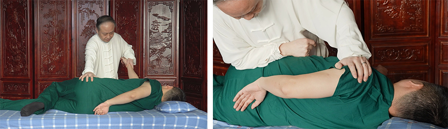 该法是㨰法、推法、揉法、点法的复合手法。患者取舒适体位,术者以前臂为接触面,左右摆动前臂,滚揉放松施术部位肌肉,滚揉频率120-160次/分钟。要求术者沉肩、垂肘、悬腕,手法柔中带刚,力透肌层。能松解深层肌肉紧张,改善局部微循环。常用于腰肌劳损、腰椎间盘突出症等。